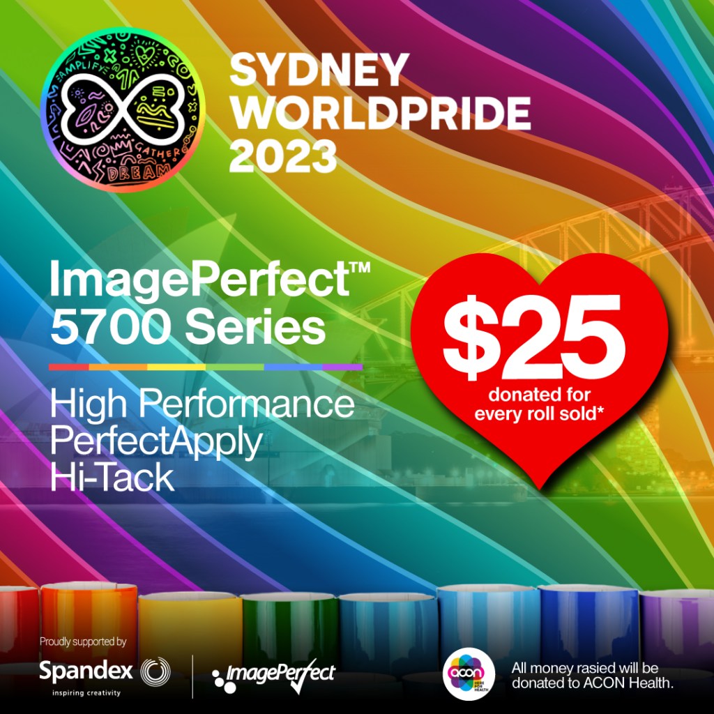 Spandex Asia Pacific and ImagePerfect™ will be donating $25 per roll (or equivalent in metres) from all ImagePerfect™ 5700 High Performance, PerfectApply and Hi-Tack Coloured Signage Films sold between the 20th and 24th of February to ACON Health in support of Sydney World Pride 2023.