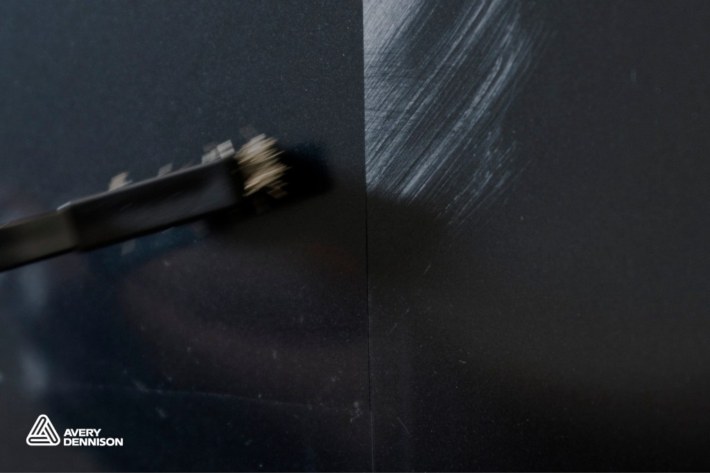 La différence entre la partie sans et avec film de protection Avery Dennison est très visible. Le PPF n’a aucune marque visible après frottement avec la brosse, tandis que la peinture autour est bien rayée.