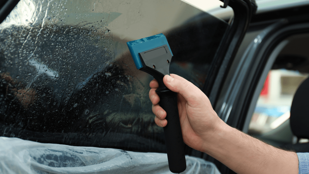 - Rimuovi delicatamente il liner protettivo dal lato della colla e posiziona la pellicola sul vetro dell’auto. Usa una spatola o un raschietto di plastica per spingere via l’acqua e l’aria, assicurandoti che la pellicola aderisca completamente al vetro.
