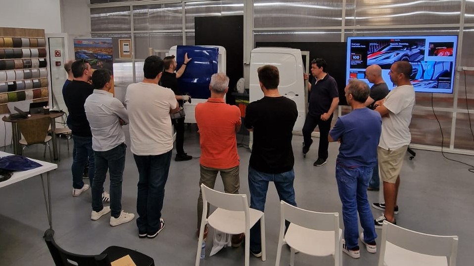 Os participantes tiveram ainda a oportunidade de aprimorar e experimentar as suas habilidades práticas com o Julio Montero, o nosso especialista em aplicações. Nesta sessão prática houve oportunidade para aprender a aplicar o vinil de forma eficiente, garantindo um acabamento de alta qualidade.