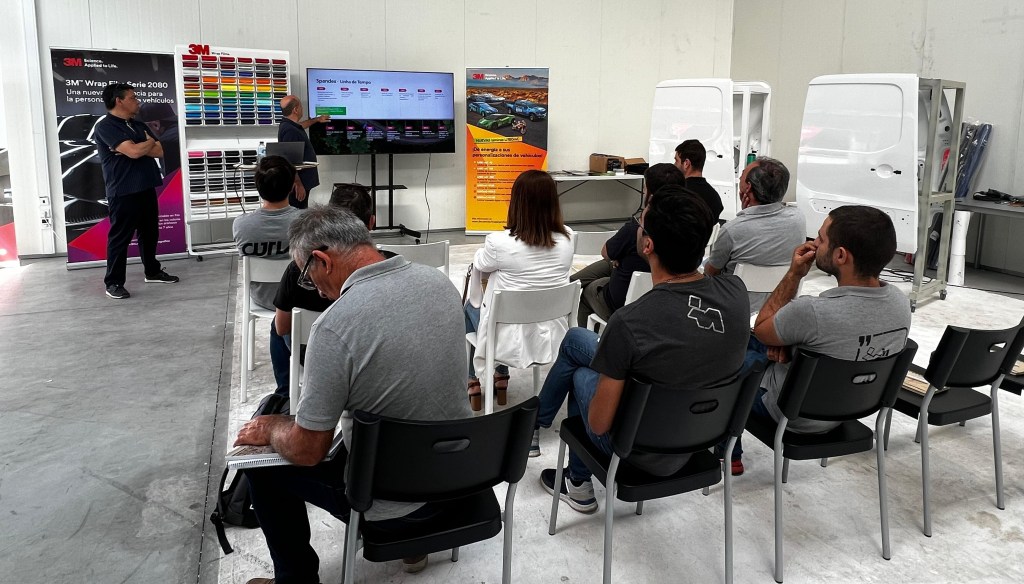 Os participantes tiveram ainda a oportunidade de aprimorar e experimentar as suas habilidades práticas com o Julio Montero, o nosso especialista em aplicações. Nesta sessão prática houve oportunidade para aprender a aplicar o vinil de forma eficiente, garantindo um acabamento de alta qualidade.